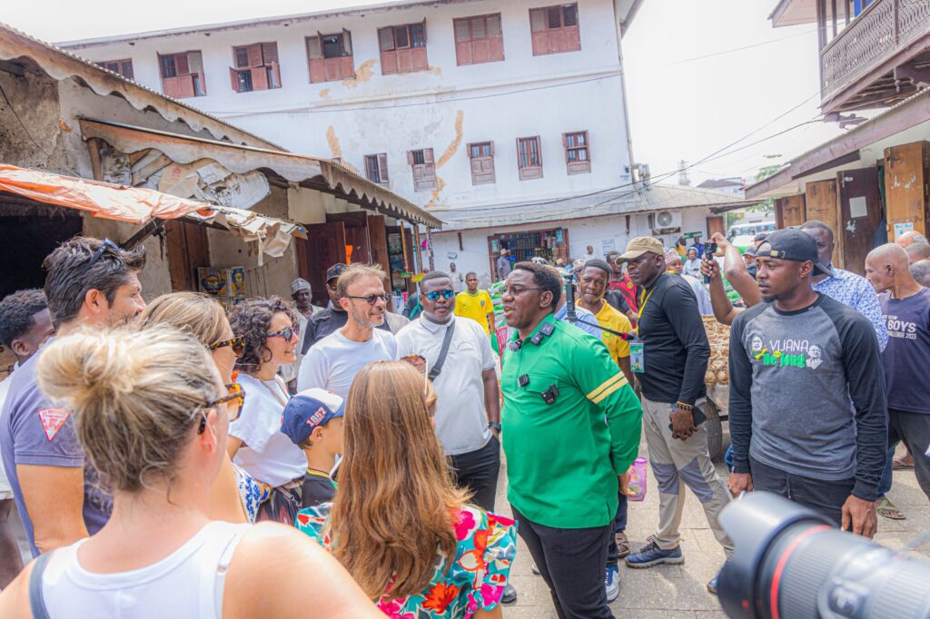 Katika hatua nyengine Paul Makonda alipata nafasi ya kusalimiana na mmoja wa wananchi wa Zanzibar alipowasili katika soko la Darajani kuendelea na kampeni za uhamasishaji wa wapiga kura kumuunga mkono mgombea urais wa CCM, Dkt. Samia Suluhu Hassan. Pembeni ni baadhi ya wananchi waliokusanyika kushuhudia tukio hilo.