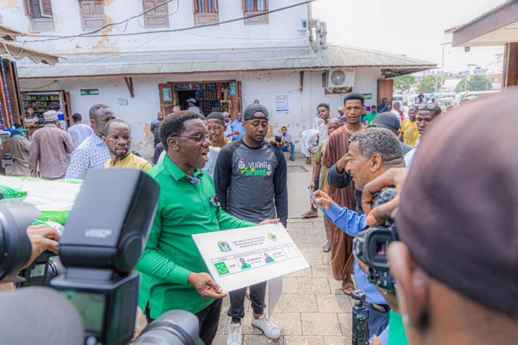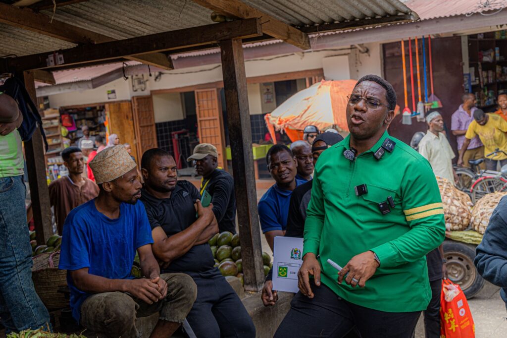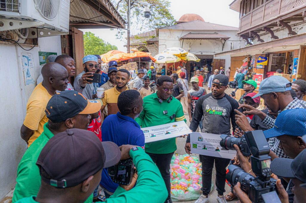 Mgombea Ubunge wa Jimbo la Arusha Mjini kupitia CCM, Paul Makonda akizungumza na baadhi ya wafanyabiashara na wananchi katika soko la Darajani, Zanzibar huku akionesha mfano wa karatasi ya kupigia kura akihamasisha wananchi kupiga kura kwa mgombea urais wa Jamhuri ya Muungano wa Tanzania kupitia Chama Cha Mapinduzi (CCM), Dk. Samia Suluhu Hassan pamoja na mgombea mwenza wake Dk. Emmanuel Nchimbi katika uchaguzi mkuu wa mwaka 2025.